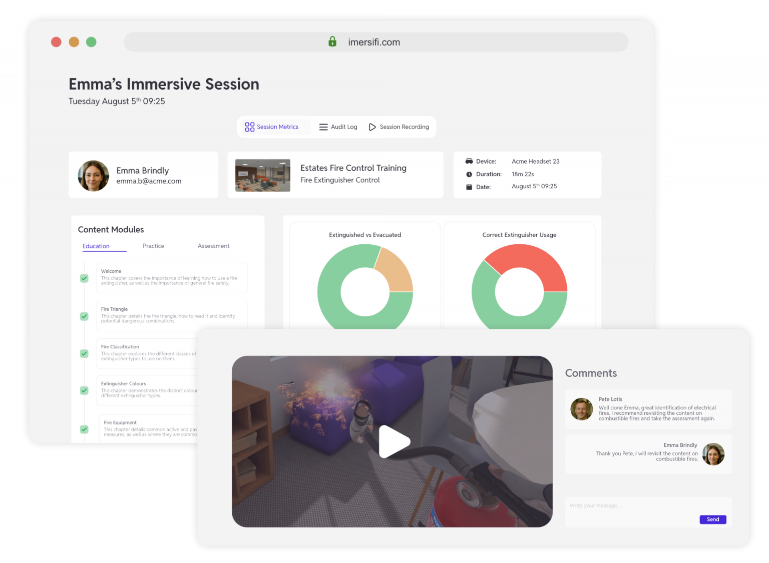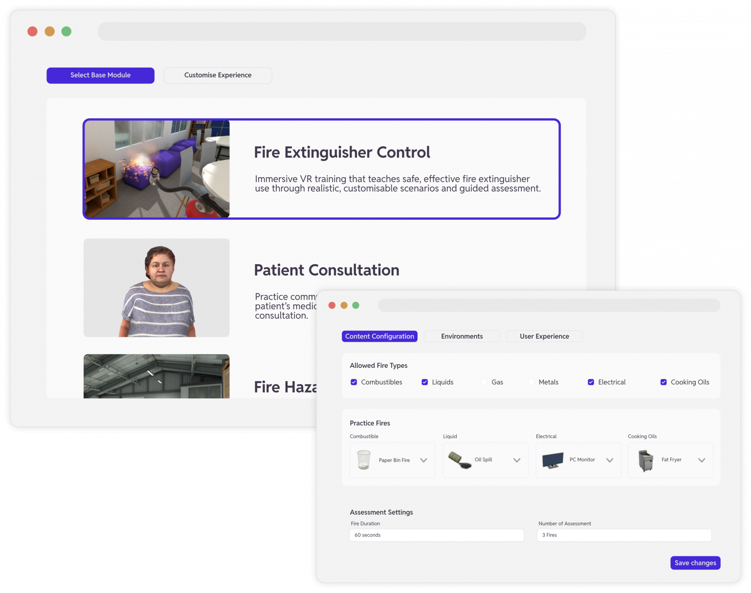 Immersive VR training that teaches safe, effective fire extinguisher use through realistic, customisable scenarios and guided assessment.